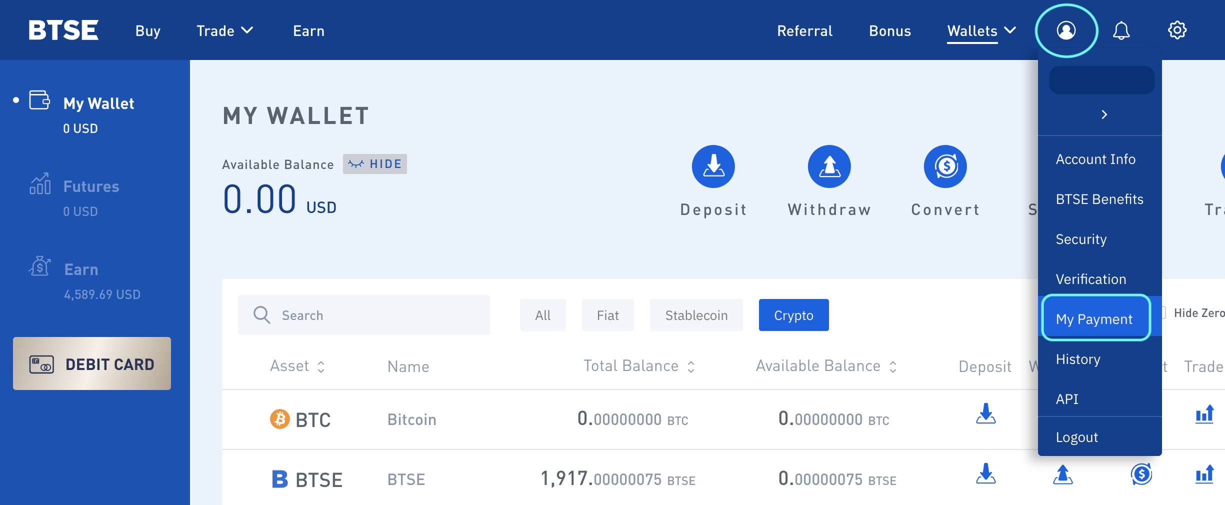- To activate the fiat deposit and withdrawal functions, please complete the KYC verification process. Users who have not completed this process cannot use any fiat-related functions on BTSE. (for more information on the verification process, please visit this link: (Identity Verification)