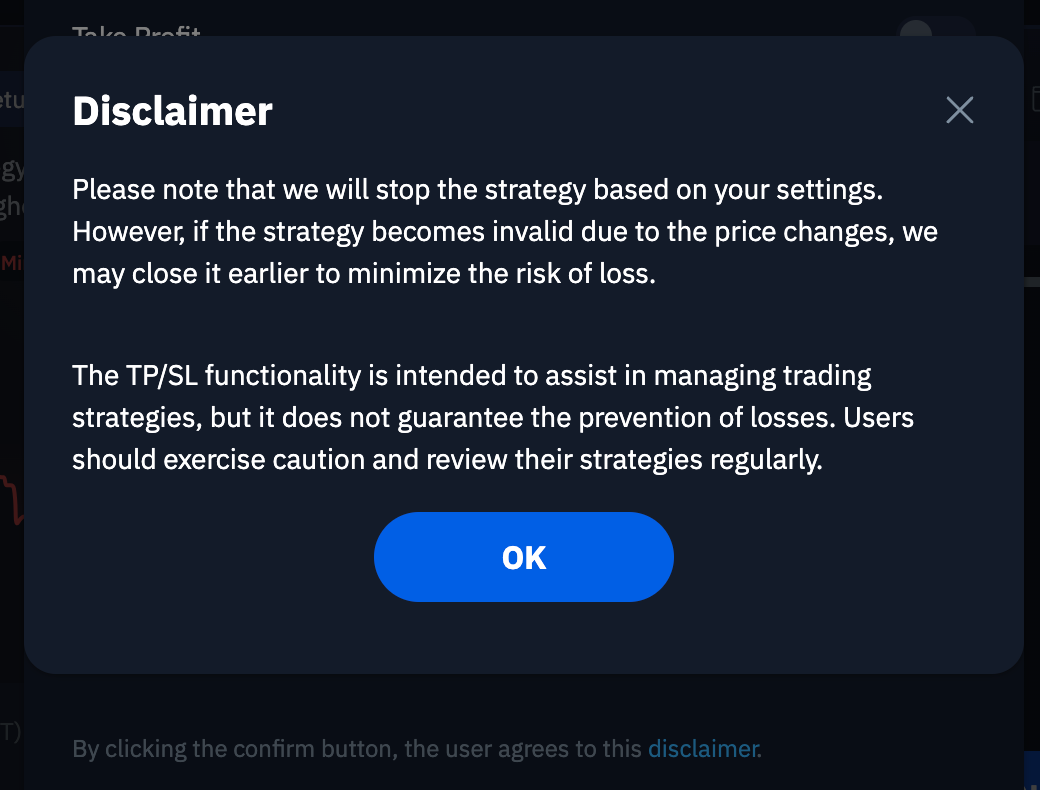 A: Sometimes, due to market fluctuations or slippage in position prices, the final P&L upon stopping the strategy may differ from the expected values set by the user when he/she places the final order. We recommend thoroughly reviewing the Risk Control feature description before setting your order up, and implementing appropriate risk management for your strategy.