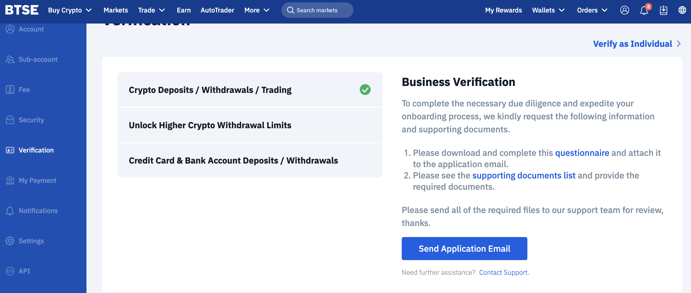 - Log in to your BTSE account and go the verification page