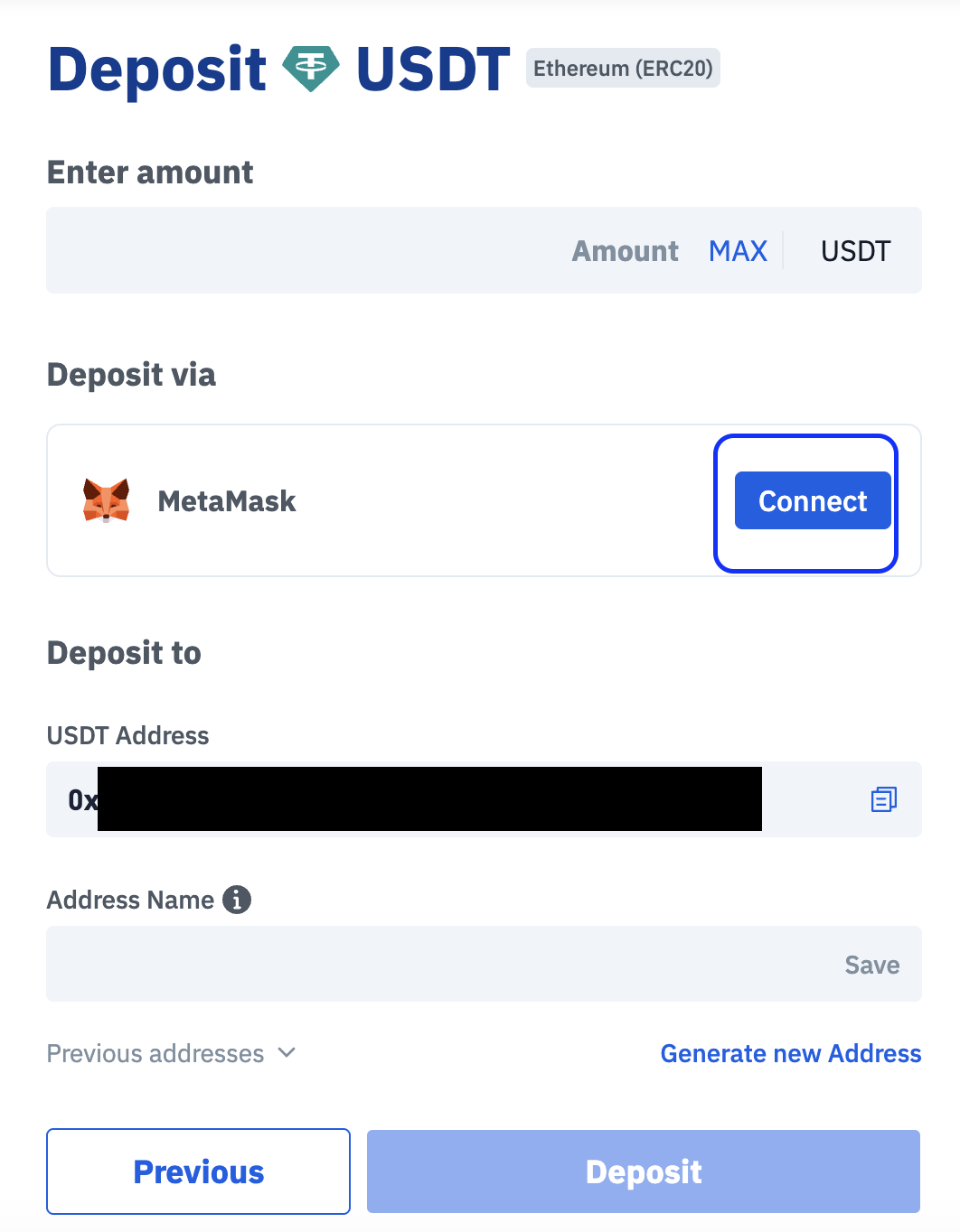 • Select Connect to link your MetaMask wallet to your Deposit account.