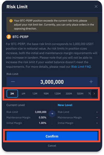 当您的当前持仓与新下单规模之和超过现有的风险限额时,系统将提示您在下新订单前升级风险限额等级。相反地,在平掉大额仓位后,您也可以手动下调风险限额等级,以降低所需的保证金门槛。